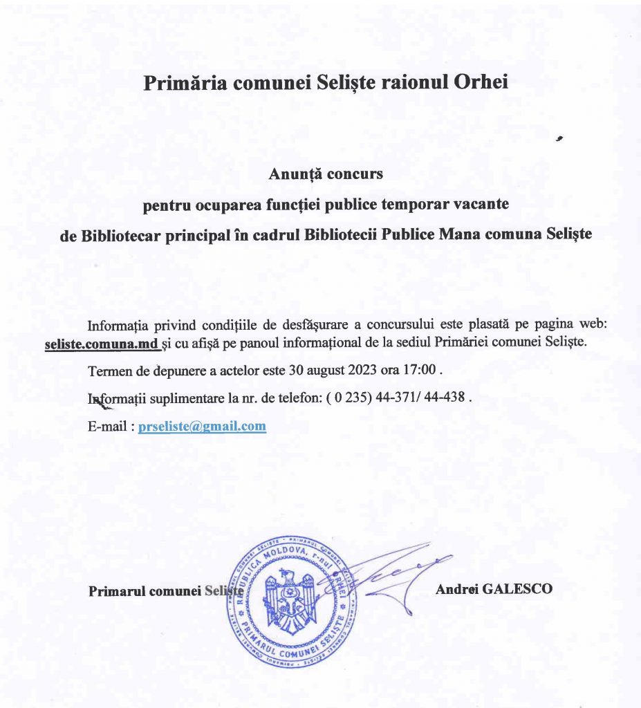 ANUNȚ!!! Concurs pentru ocuparea funcției vacante de bibliotecar principal în cadrul Bibliotecii Publice Mana ,comuna Seliște raionul Orhei