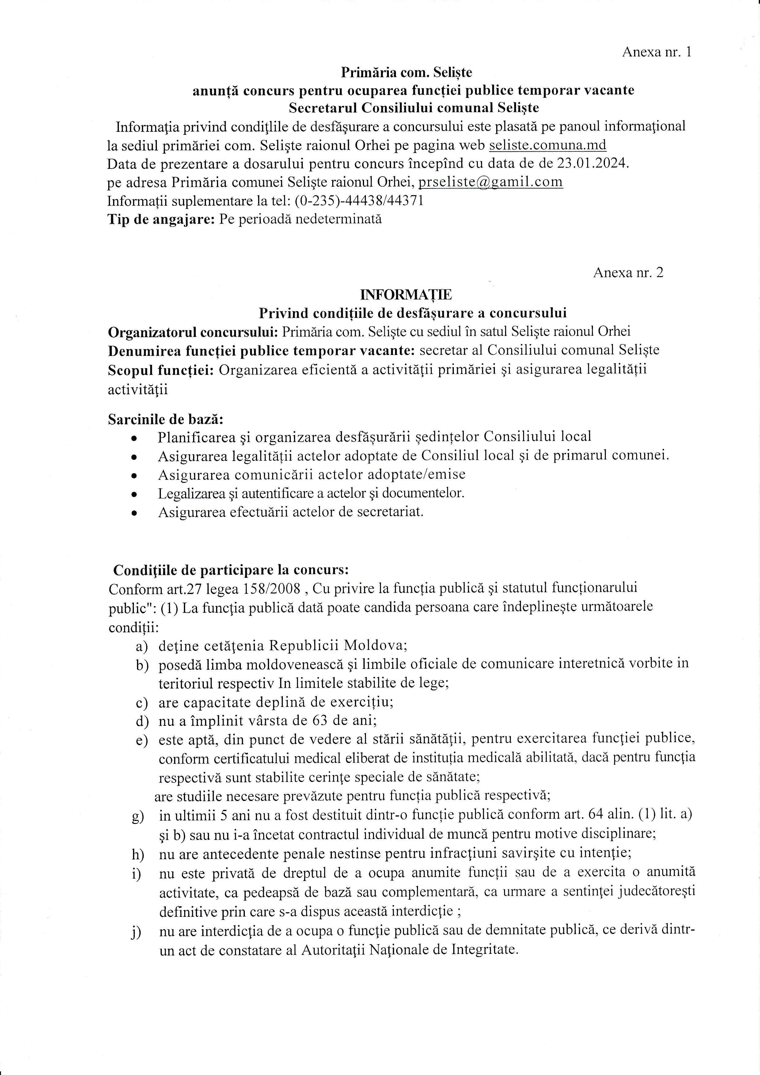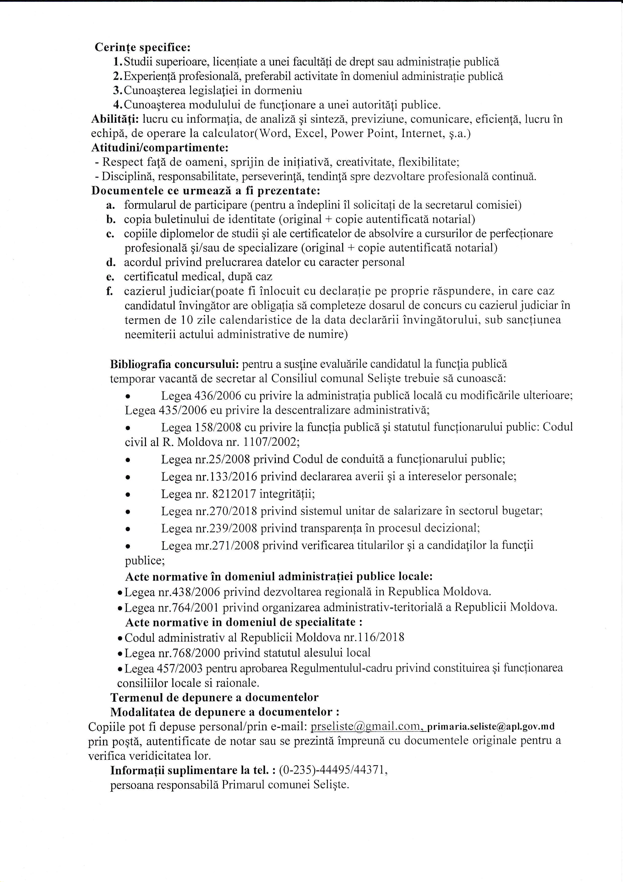 ANUNȚ PENTRU CONCURS LA FUNCȚIA DE SECRETAR AL CONSILIULUI COMUNEI SELIȘTE